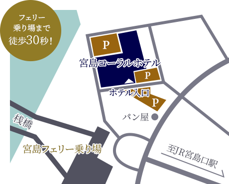 フェリー乗り場まで徒歩約30秒。宮島までの所要時間は約10分です。